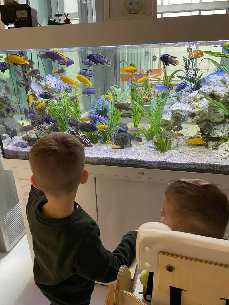 Dag één verliep tegen alle verwachtingen in prima. Hij deed het zonder ook maar 1x te zeuren... Hij moest ongetwijfeld ook nog wat bekomen van de heftige emoties van de dag voordien. Op dag 2 werd de opdracht al zwaarder. Hij vond het bedarrest vreselijk. Kine Veerle die we best goed kennen merkte dat dit absoluut niet goed is voor zijn welbevinden. Zij gingen zorgen voor een oplossing. Die oplossing bleek een aangepaste triptrap stoel met wieltjes en een verhoogde hoofdsteun. De dokters kwamen even kijken, maar het systeem bleef prima afwateren en dus kreeg Mace toestemming voor een gecombineerde bed/stoel-arrest. Wat een verademing!!! Nu konden we tenminste eens spelen aan tafel, wat afwisselen met altijd te liggen én naar zijn favoriete plek in het ziekenhuis: de visjes!!