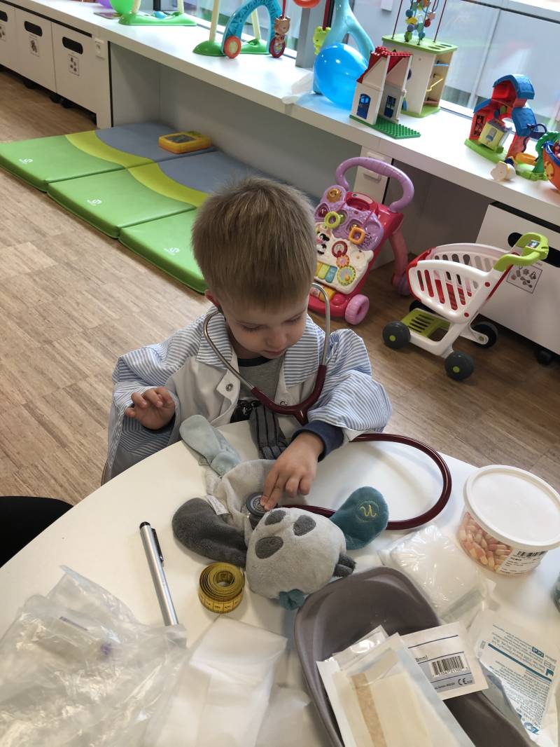 S morgens komt Lewis op bezoek. Letterlijk ons zonnestraaltje tussen al het onweer van de voorbije dagen. De verpleging raad aan om met hem even langs het teddy beer hospitaal te gaan om mijn gedachten te verzetten. En dat doet inderdaad goed! Heerlijk om hem bezig te zien... panda krijgt pleisters, spuitjes, pilletjes,... dat Lewis zijn leven de komende tijd anders gaat zijn kunnen we niet omheen. Hij wordt meegesleurd in dit verhaal. Ook al ben ik er zeker van dat iedereen er mee voor gaat zorgen dat hij geen liefde en aandacht te kort gaat komen.