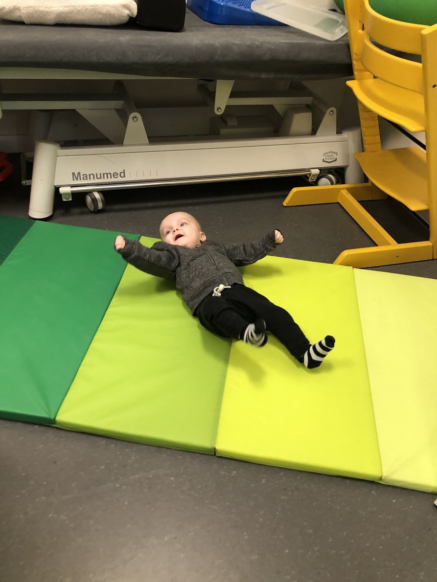 Het was zeker een aangename eerste keer. De laatste 10 minuten waren er teveel aan maar ondanks dat Mace ziek is ging het echt wel goed. De kinesist is een heel rustige, jonge vrouw die haar tijd neemt. Mace was onmiddelijk op zijn gemak bij haar. Hij heeft een reeks van oefeningetjes gedaan en wij mogen deze ook allemaal thuis doen om zijn spiertjes sterker te maken.